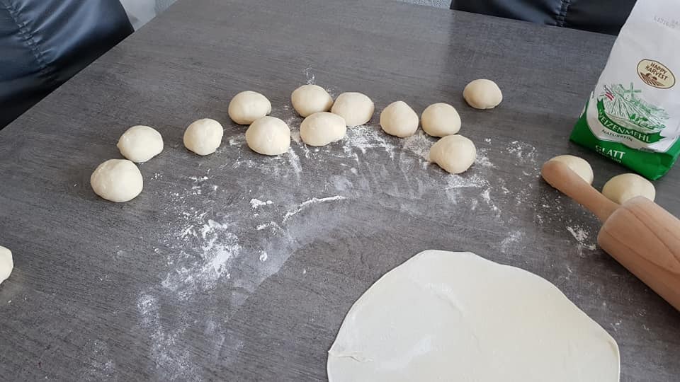Brumi duhet te jete i fort te ngjeshet mire nese e bani me dore, nese me mikser e perzini 5 munuta. 15 minuta e leme te pushoj pastaj e ndajm ne kuleq si te pites e rritim peten sa ferterja dhe i pjekim ne te dyja anet ka nja 2 minuta jo shum mi tha ato qe i pjek i mbulon me pecet mos mu tha ose folje .